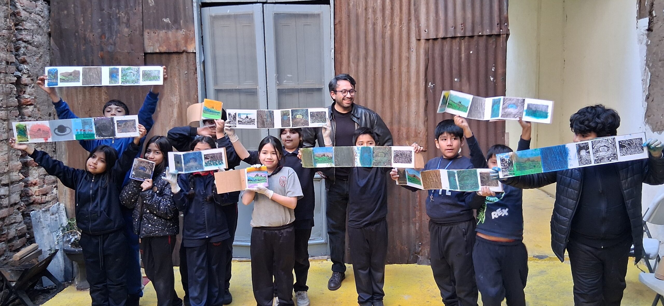 La primera actividad se realizó con los alumnos de la Escuela República de Panamá. La jornada comenzó con una mediación en la que Sebastián introdujo conceptos clave del arte contemporáneo, el paisaje, el grabado y la pintura. Posteriormente, los estudiantes participaron en un taller práctico de pintura sobre plantillas previamente grabadas por el artista, incorporando colores, formas y experimentando con la composición. Esta experiencia les permitió explorar su creatividad y vincularse con el arte de manera lúdica y participativa.